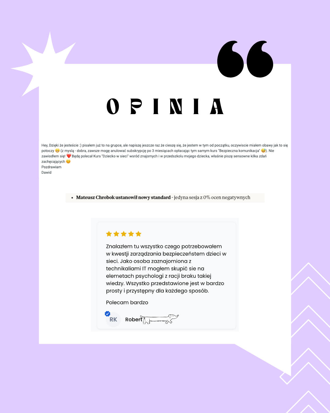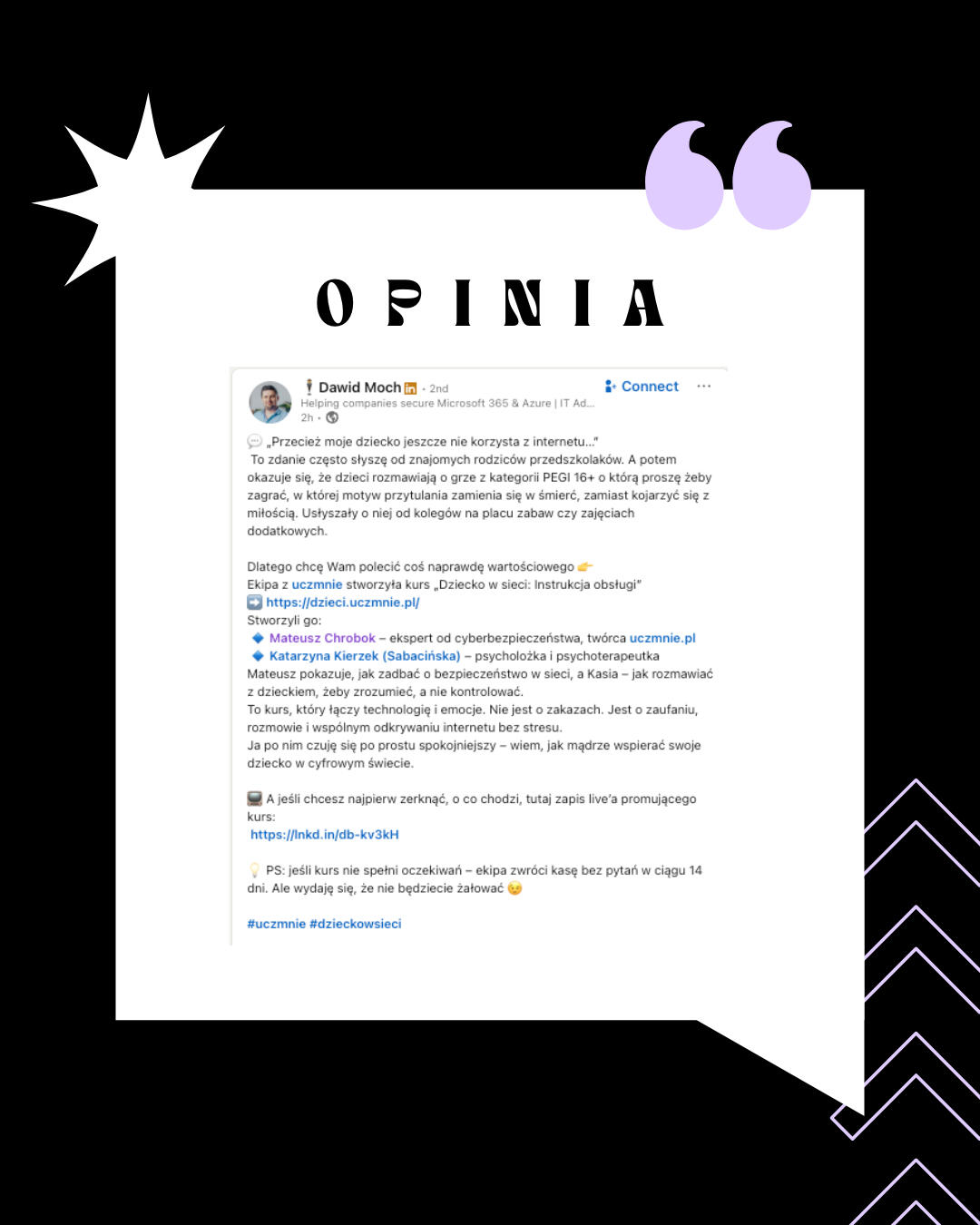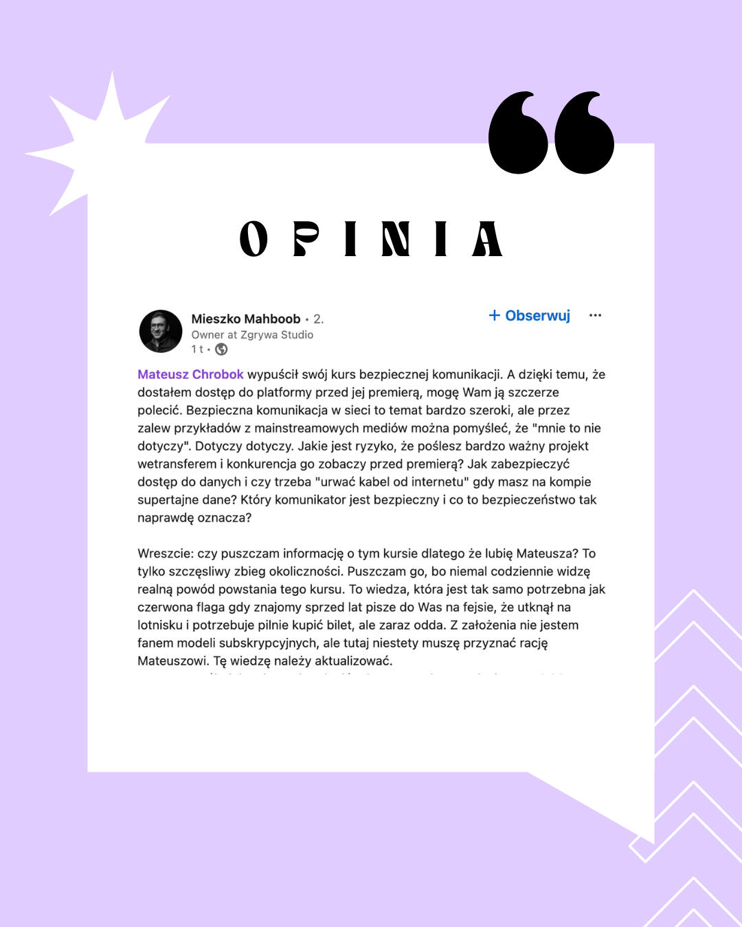 Chcę, by każdy mógł zrozumieć i wdrożyć podstawy bezpieczeństwa cyfrowego – bez technicznego żargonu, bez trudnych teorii czy skomplikowanych definicji. Dlatego stworzyłem Uczmnie i swoją zdobywaną latami wiedzę przekazuję w sposób zrozumiały dla każdego, używając przykładów z życia codziennego i prostych analogii.Na Uczmnie przygotowałem konkretne narzędzia, które pomogą Ci zrozumieć zagrożenia w sieci i obronić się przed nimi, ale też w pełni wykorzystać szanse, jakie niesie ze sobą rozwój świata wirtualnego. Kursy, ebooki miniszkolenia. Nowe treści dostarczam na platformę niemal w każdym miesiącu.Nie zawsze mogę odpowiedzieć każdemu osobiście, dlatego stworzyłem miejsce, w którym każdy może skorzystać z mojej wiedzy, ale też innych ekspertów. Poza mną, na Uczmnie kursy prowadzą lub współprowadzą specjaliści w swojej dziedzinie: Jakub Mrugalski, Jakub Nowak, Katarzyna Kierzek.
