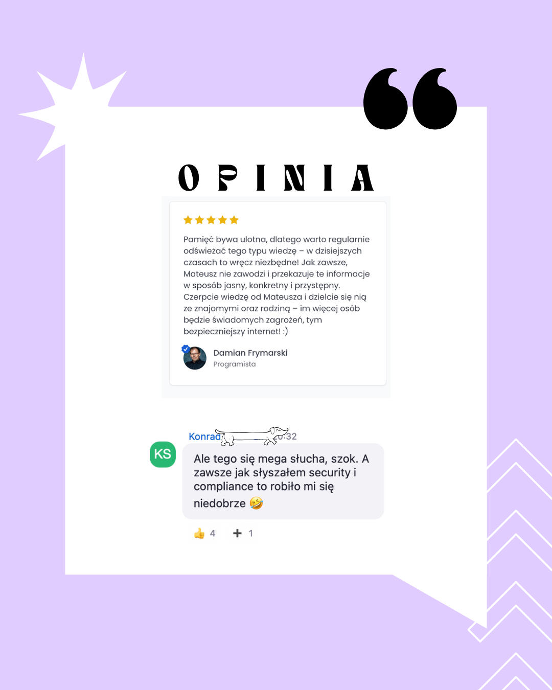 Jesteś tym gościem, do którego wszyscy przychodzą po poradę w sprawie zabezpieczeń? Kursy nie tylko wyręczą Cię w tłumaczeniu komplikowanych konceptów bezpieczeństwa swoim bliskim, ale znajdziesz w nich też coś dla siebie. Do każdego szkolenia dodaję bardziej zaawansowane treści "dla geeków" i z myślą o kursantach takich jak Ty, tworzę również szkolenia na wyższym poziomie zaawansowania.